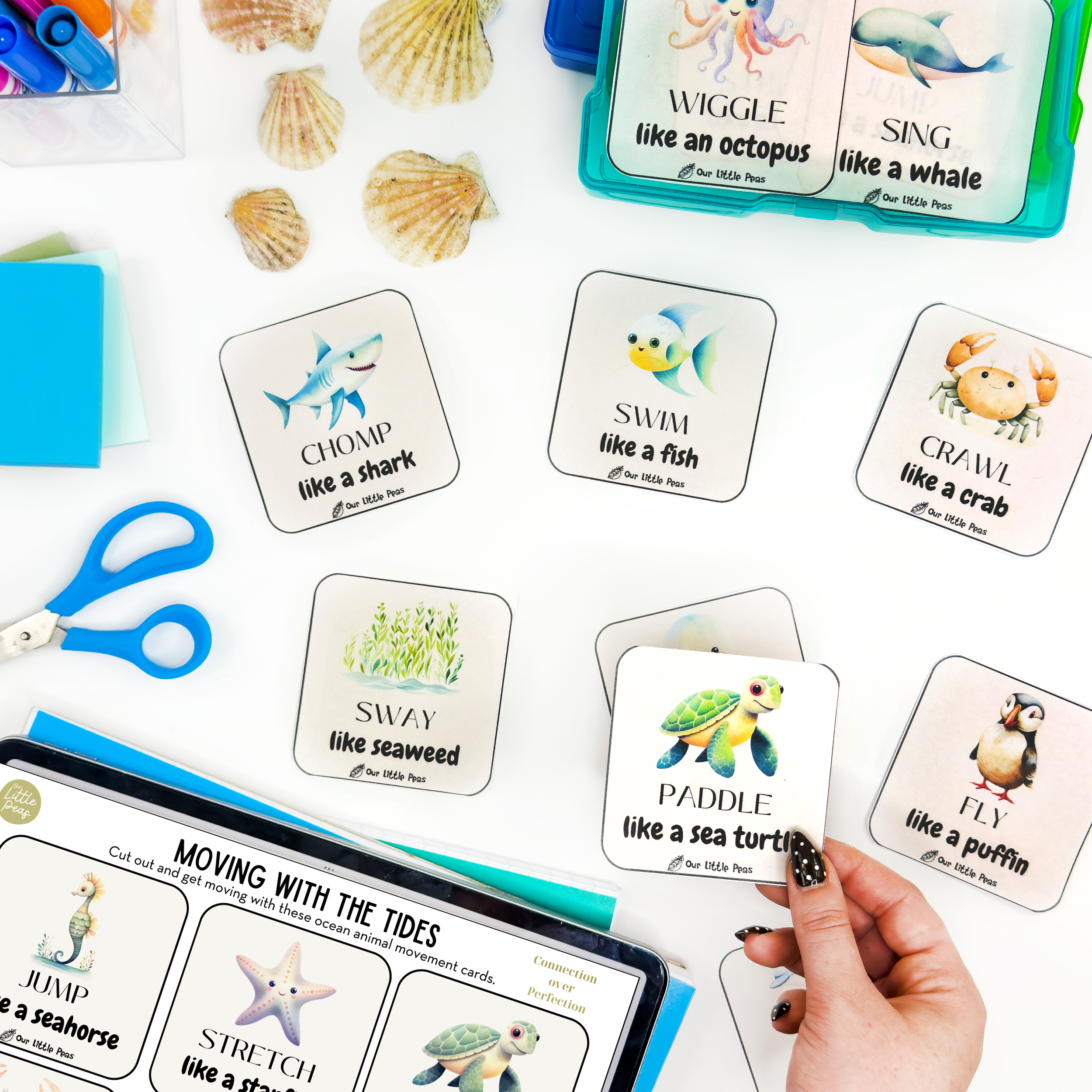 If you have a mover, shaker, climber, or jumper at home, my free Moving With the Tides ocean-themed gross motor cards are a beautiful way to channel that ENERGY into LEARNING.
